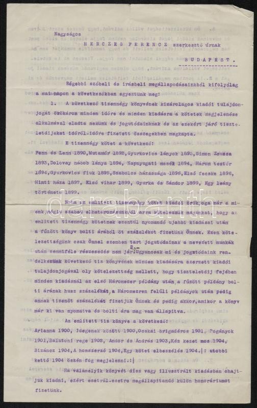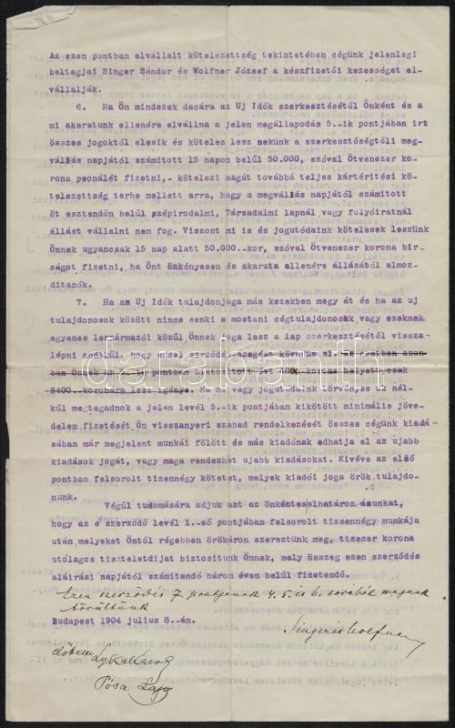 1904 Herczeg Ferenc (1863-1954) író, szerkesztő és Singer és Wolfner könyvkiadó megállapodása az író műveinek kiadásáról, és a fizetendő juttatásokról, havi jövedelem juttatásról, Singer és Wolfner aláírással, pár soros kézzel írt rájegyzéssel, kihúzott sorokkal, tanúk aláírásával.