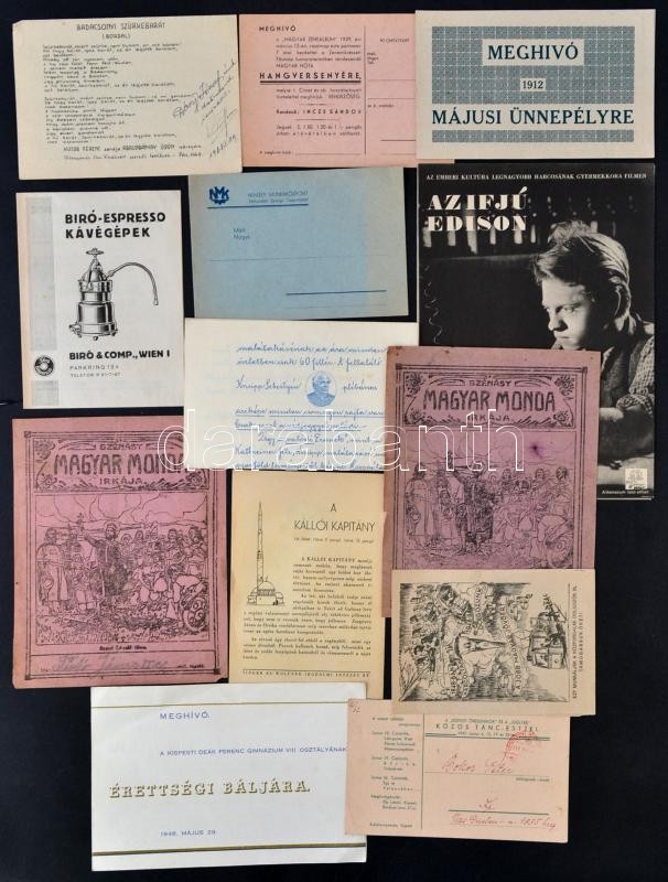 1912-1948 Vegyes papírrégiség tétel, 12 db, közte reklámokkal, meghívókkal, közte a "Kispesti Öregdiákok" és a "Gólyák" táncestélyének (1947) és a Kispesti Deák Ferenc Gimnázium érettségi báljának meghívói