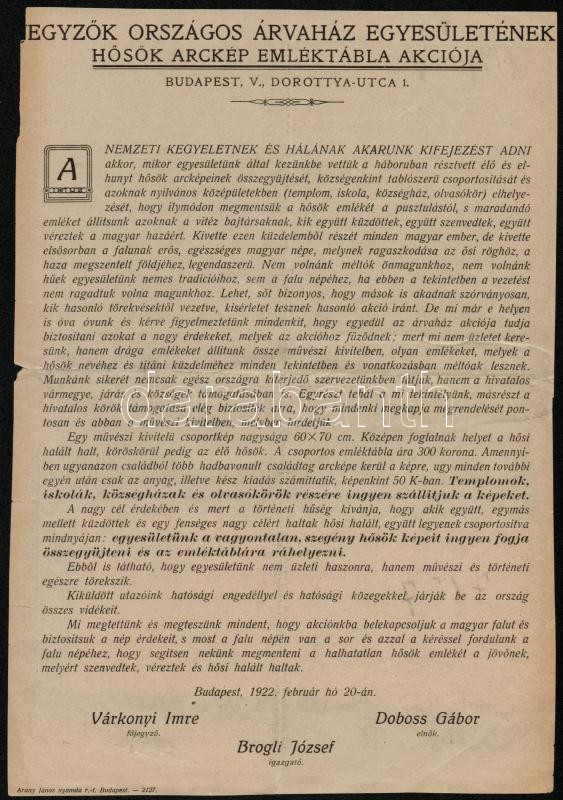 1922 Jegyzők Országos Árvaház Egyesületének Hősök Arckép Emléktábla akciójának röplapja, Bp., Arany János-ny., szakadással, az egyik felső sarkánál kis hiánnyal.