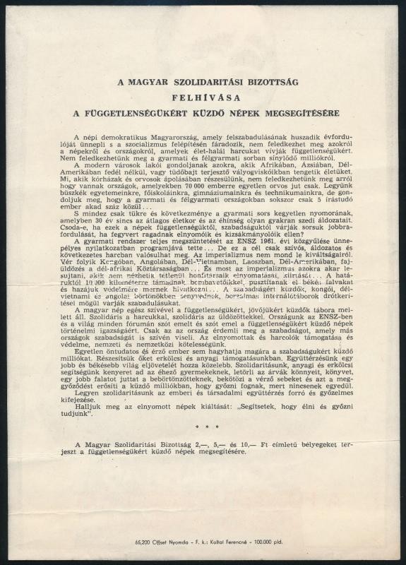 Beschreibung: 1965 "Szolidaritás a függetlenségükért küzdő népekkel", a Magyar Szolidaritási Bizottság felhívása, szórólap, ofszet, 24×17 cm