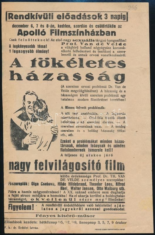 Beschreibung: cca 1920 A tökéletes házasság. Csak felnőtteknek, az első nagy sexuális tárgyú hangosfilm szórólap 15x24 cm