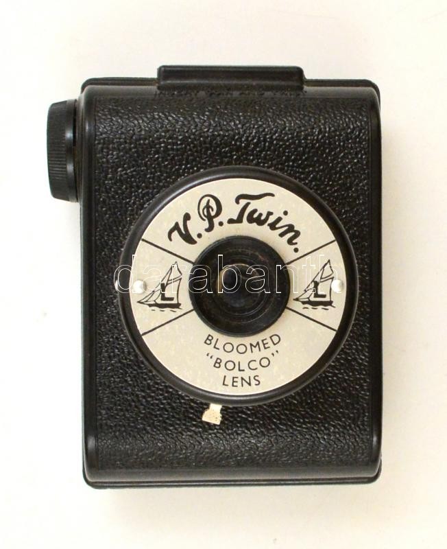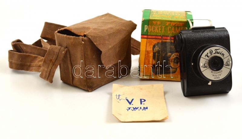 cca 1930 VP Twin, bakelitvázas angol mini fényképezőgép, erdeti bőr tokjában, dobozában, leírással, szép állapotban / Vintage British pocket camera, with original leather case, box, manual, in good condition