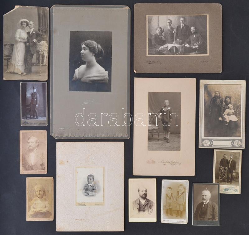 1880-1920 Vegyes keményhátú fotó tétel, 13 db, többségében potré fotók, különféle műtermekből, közte Nagy György, Kézdivásárhely, Kovács Elek, Nagybánya, Schiller Mór, Ruttka, ..stb, változó állapotban, az egyik sérült, 10x6 cm és 14x10 cm közötti méretben