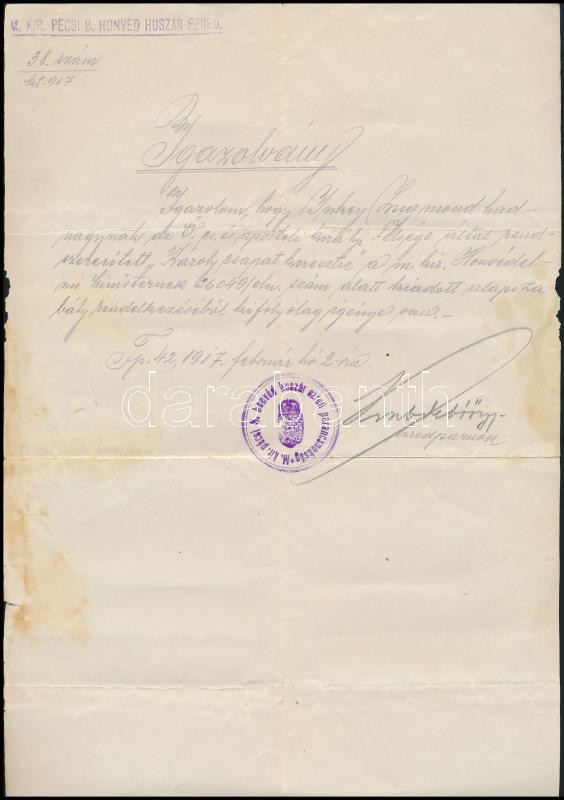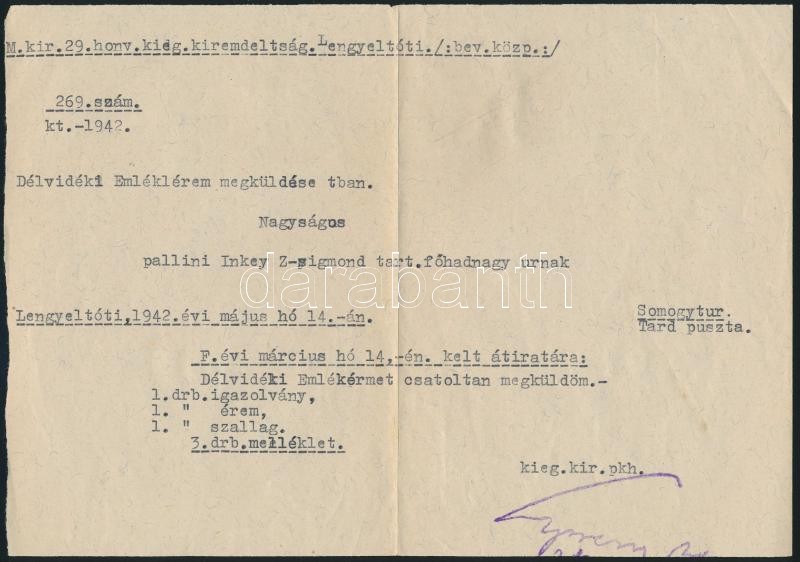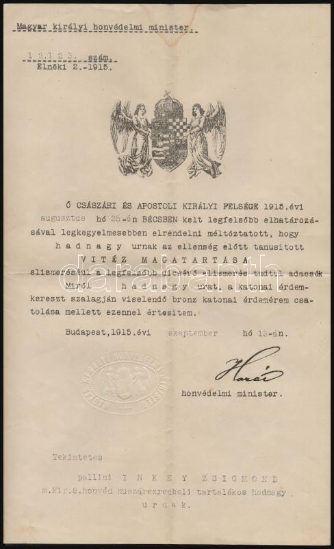 1915-1942 pallini Inkey Zsigmond m. kir. pécsi 8. honvéd huszárezred tagjának bronz katonai érdeméremre viselését adományozó okirata, Hazai Samu honvédelmi miniszter nyomtatott aláírásával, valamint a bronz érdemérem adományozásáról szóló értesítés (1915), valamint a Károly csapatkereszt viselésére jogosító igazolvány (1917), valamint a Délvidéki Emlékéremről szóló értesítés (1942)