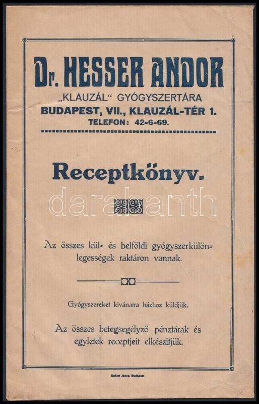 1920-1930 Dr. Hesser Andor "Klauzál" gyógyszertárának receptkönyves bo... https://www.darabanth.com/de/333-Fernauktion/333.0/Kunst-Dokumente-andere-Sammelgebiete/Werbungen~500025/1920-1930-Dr-Hesser-Andor-Klauzal-gyogyszertaranak-receptkonyves-boritekja~II1865404