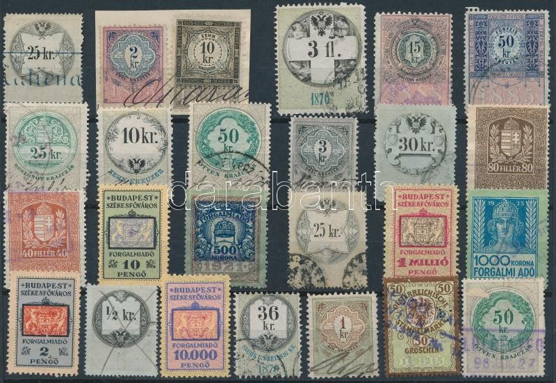 Beschreibung: Magyar és osztrák okmánybélyegek, összesen 25 db