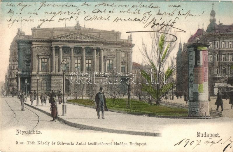 1907 Budapest VIII. Népszínház, hirdetőoszlop. Tóth Károly és Schwartz... https://www.darabanth.com/de/334-Fernauktion/334.0/Ansichtskarten/Ungarn~2000006/1907-Budapest-VIII-Nepszinhaz-hirdetooszlop-Toth-Karoly-es-Schwartz-Antal-kezifesteszeti~II1872920
