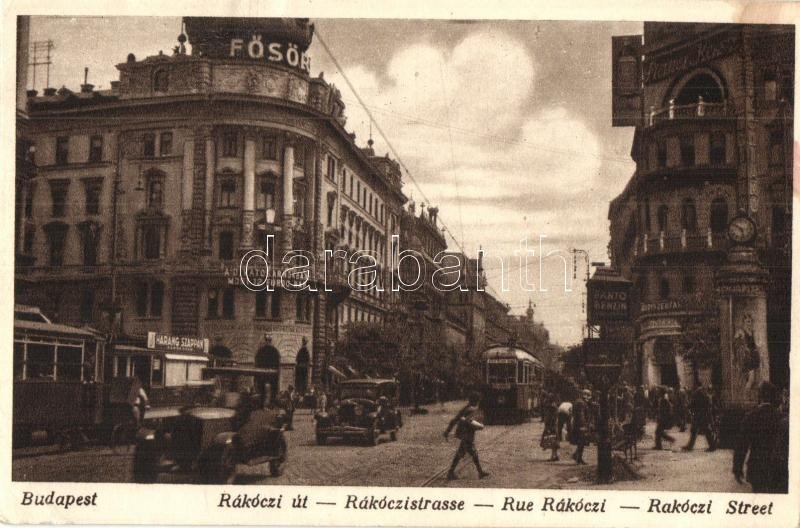 Beschreibung: Budapest VIII. Rákóczi út (Blaha Lujza tér), automobilok, villamosok, "A divatcsarnokban most 12 fürdő nap", Harang szappan reklám, Fősör (EK)