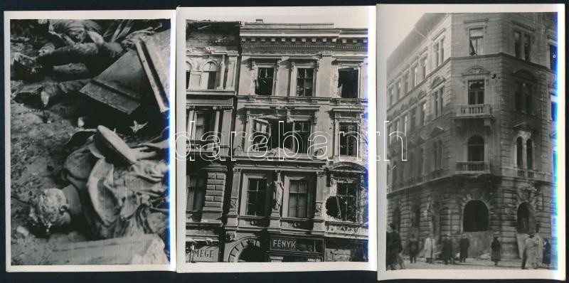 Beschreibung: 1956 5 db fotó a forradalom idejéből, rajtuk kilőtt tankok, megsérült épületek, halottak, 6x9 cm