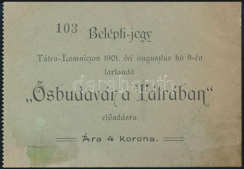 1901 Tátralomnic belépőjegy az augusztus 9-én tartandó "Ősbudavár a Tá... https://www.darabanth.com/de/334-Fernauktion/334.0/Kunst-Dokumente-andere-Sammelgebiete/Dokument~17/1901-Tatralomnic-belepojegy-az-augusztus-9-en-tartando-Osbudavar-a-Tatraban-eloadasra~II1874215