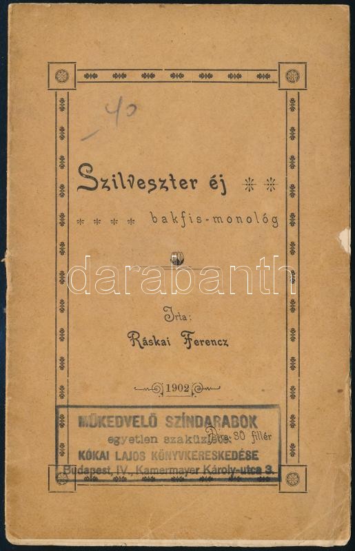 1902 Ráskai Ferenc: Szilveszter éj. Bakfis monológ. Komárom, 1902, Sch... https://www.darabanth.com/de/334-Fernauktion/334.0/Kunst-Dokumente-andere-Sammelgebiete/Drucksachen~31/1902-Raskai-Ferenc-Szilveszter-ej-Bakfis-monolog-Komarom-1902-Schonwald-Tivadar-8-p-Kiad~II1873573