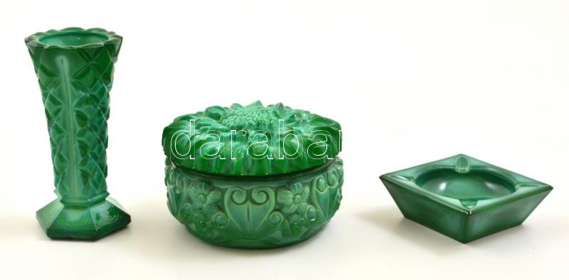 Beschreibung: 3 db-os malachit üveg asztali készlet: bonbonniere (d:10 cm), fogpiszkáló tartó / vázácska és hamuzó