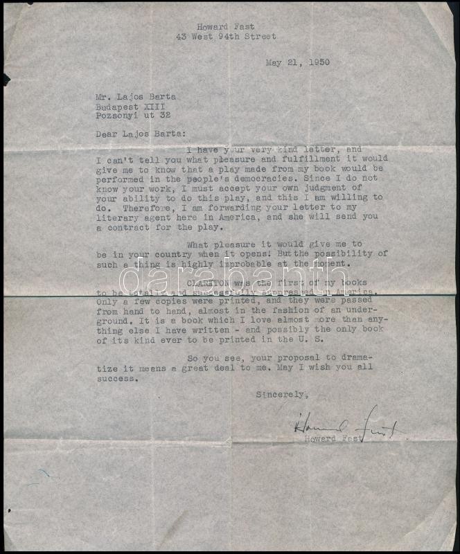 1950 Howard Fast (1914-2003) amerikai regényíró angol nyelvű gépelt le... https://www.darabanth.com/de/334-Fernauktion/334.0/Kunst-Dokumente-andere-Sammelgebiete/Historische-Dokumenten-Handschriften~18/1950-Howard-Fast-1914-2003-amerikai-regenyiro-angol-nyelvu-gepelt-levele-Barta-Lajos-1878-19~II1873583