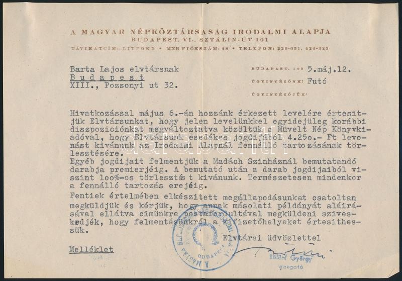 Beschreibung: 1955 Bölöni György (1882-1959) Ãró, Magyar Népköztársaság Irodalmi Alapjának igazgatójának (1950-1959) gépelt levele Barta Lajos (1878-1964) Ãró részére, tartozás törlesztése ügyében, Bölöni György aláÃrásával, fejléces papÃron.