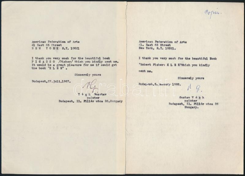 1967-1968 Végh Gusztáv (1889-1973) festő, grafikus gépelt, angol nyelvű köszönő levelei American Federation of Art részére, Végh Gusztáv saját kezű aláírásaival.