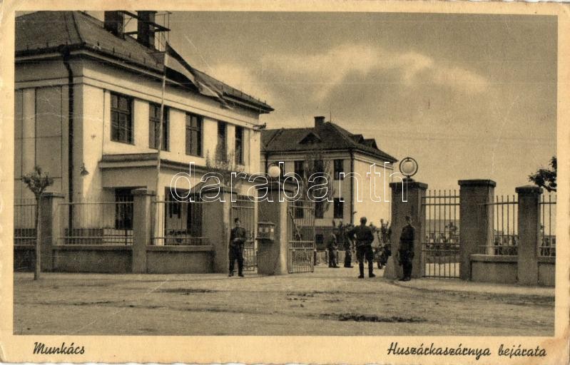 Munkács, Mukacheve, Mukacevo; Huszár kaszárnya bejárata, laktanya, mag... https://www.darabanth.com/de/335-Fernauktion/335.0/Ansichtskarten/Karpatenukraine~2000007/Munkacs-Mukacheve-Mukacevo-Huszar-kaszarnya-bejarata-laktanya-magyar-zaszlo-katonak-H~II1880938