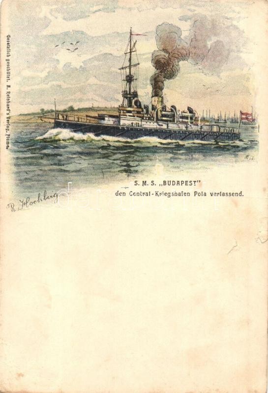 Beschreibung: SMS Budapest den Central-Kriegshafen Pola verlassend. K.u.K. Kriegsmarine art postcard. A. Reinhard's Verlag Fiume s: R. Hochberg (tear)
