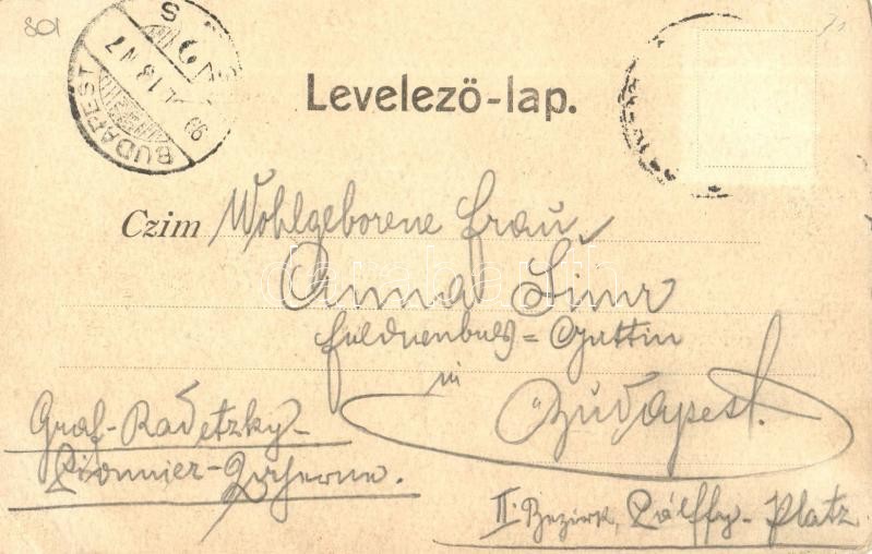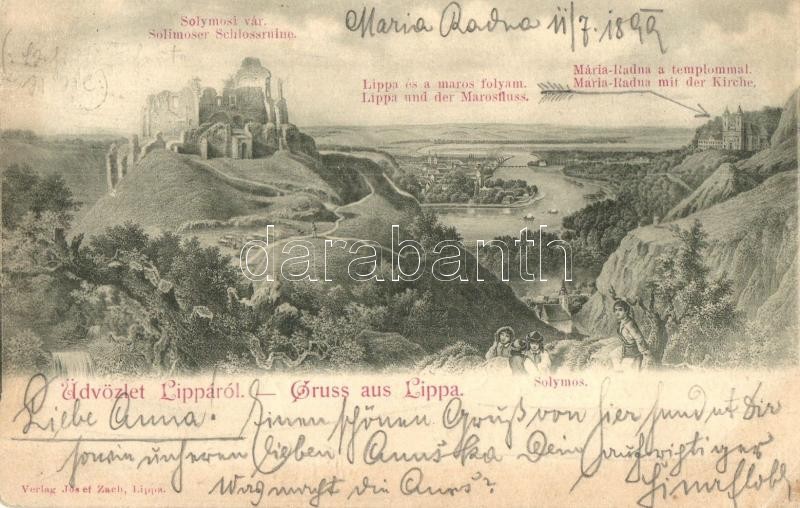 1899 Lippa, Lipova; Solimoser Schlossruine, Lippa und der Marosfluss, Mária-Radna mit der Kirche / Solymosi vár, Lippa és a Maros folyam, Máriaradnai kegytemplom. Kiadja Josef Zach / Soimos castle, Lipova with Mures river, pilgrimage church in Radna (EK)