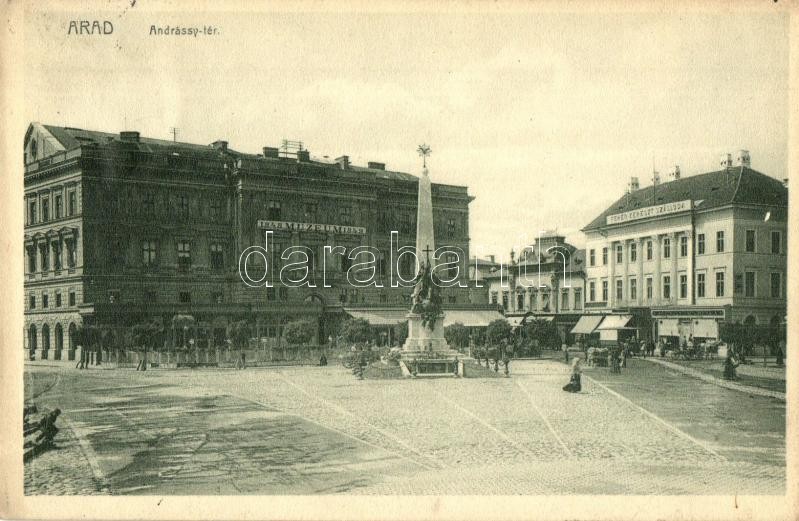 Arad, Andrássy tér, 1848-1849 Múzeum, Fehér Kereszt Szálloda, üzletek, Szentháromság szobor / square, museum, hotel, shops, Trinity statue