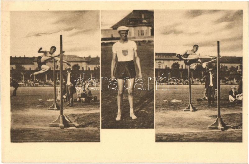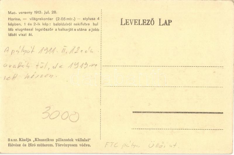 1913 MAC (Magyar Atlétikai Club) verseny, Horine (világrekorder) stílusa. 1. és 2. kép: baloldalról nekifutva bal láb elugrással legelőszor a balkarját s utána a jobb lábát viszi át. Budapest IX. Üllői út, FTC pálya. Kiadja a Klasszikus pillanatok vállalat, Révész és Biró műterem / George Horine American high jump athlete's "western roll" technique at the Hungarian Athletic Club's competition in Budapest