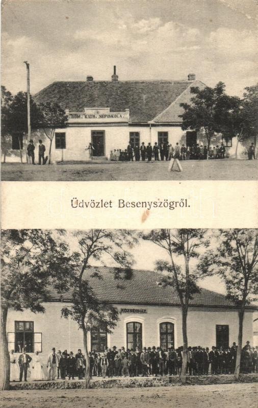 Beschreibung: Besenyszög, Községház, Római katolikus népiskola. Spiegel Márton kiadása (EK)