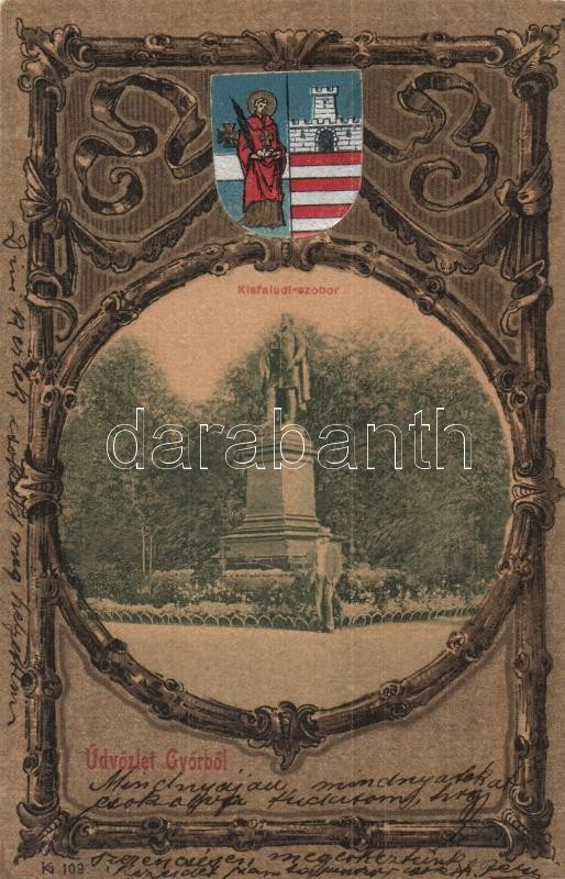 Győr, Kisfaludy szobor. Címeres szecessziós litho keret. Rőszler Károl... https://www.darabanth.com/de/335-Fernauktion/335.0/Ansichtskarten/Ungarn~2000004/Gyor-Kisfaludy-szobor-Cimeres-szecesszios-litho-keret-Roszler-Karoly-kiadasa-Art-Nouveau-~II1880211