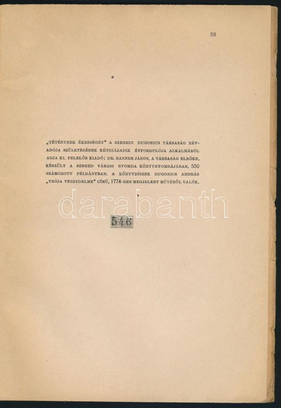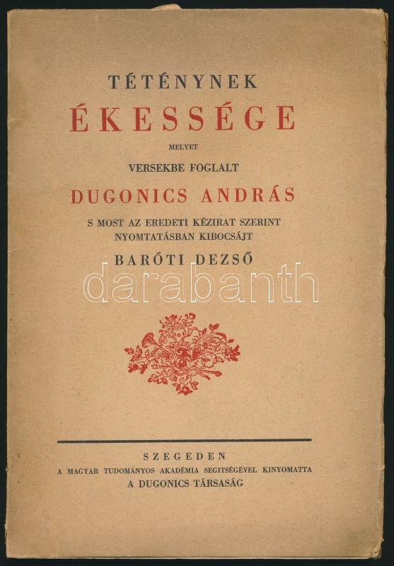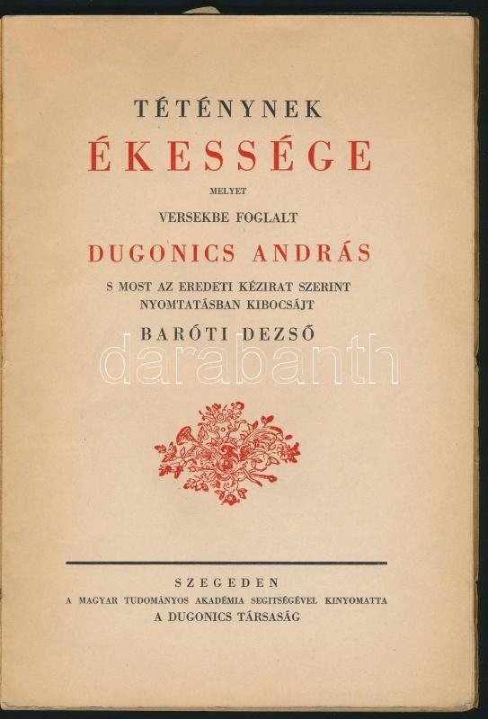 Dugonics András: Téténynek ékessége melyet versekbe foglalt Dugonics András s most az eredeti kézirat szerint nyomtatásban kibocsájt Baróti Dezső. Szeged,(1940),Dugonics Társaság, 59 p. Kiadói papírkötés, nagyrészt felvágatlan példány. Számozott (550/546) példány.