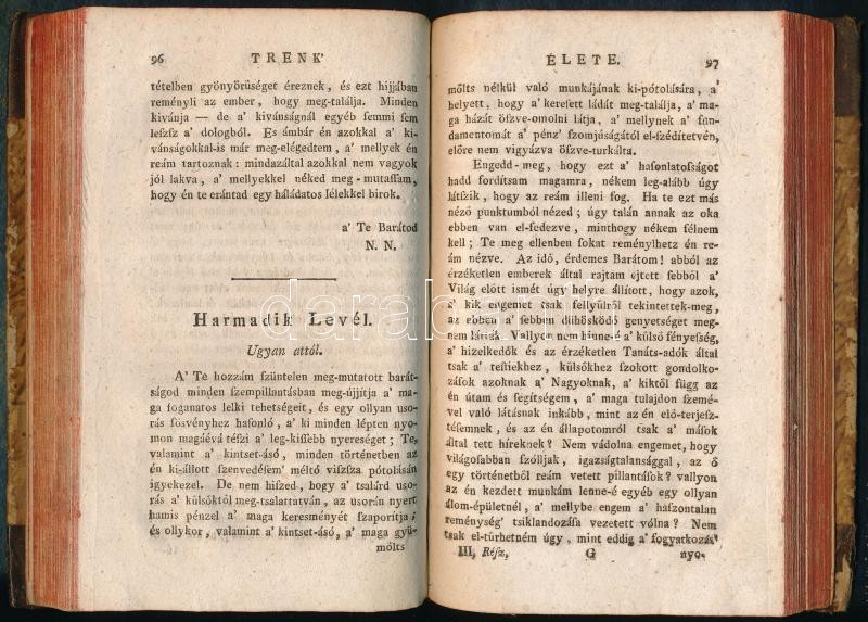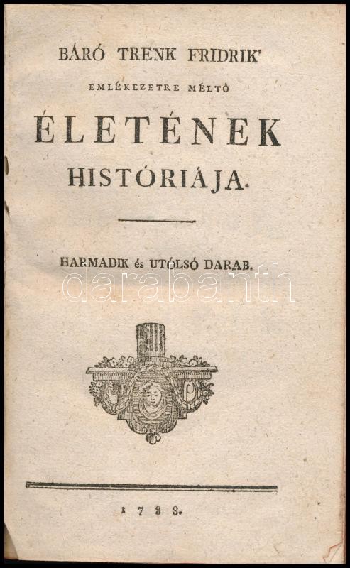 [Trenck, Friedrich von]: Báró Trenk Fridrik emlékezetre méltó életének históriája. Harmadik és utolsó darab. hn., 1788, ny.n., 2+230+4 p. Korabeli álbordás félbÅ‘r-kötés, festett lapélekkel, kissé kopott borÃtóval, az elülsÅ‘ és az utolsó szennylapon tulajdonosi bejegyzésekkel, de belül szép, megkÃmélt állapotban.