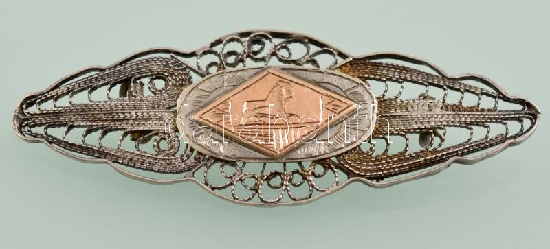 Beschreibung: Ezüst(Ag) bross, filigrán díszítéssel, jelzés nélkül, 6×2 cm, nettó: 6,6 g