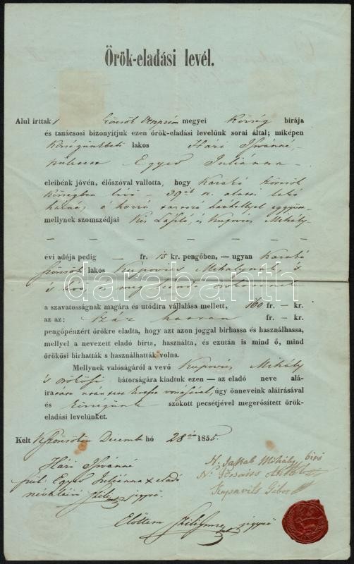 Beschreibung: 1855 Karakószörcsök, örökeladási levél, viaszpecséttel