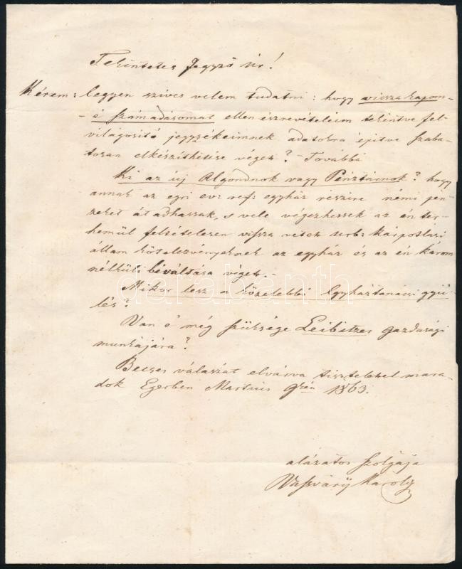 Beschreibung: 1863 Vasváry Károly egri nemes Turcsányi Sándor egri evangélikus egyházi jegyzőnek
