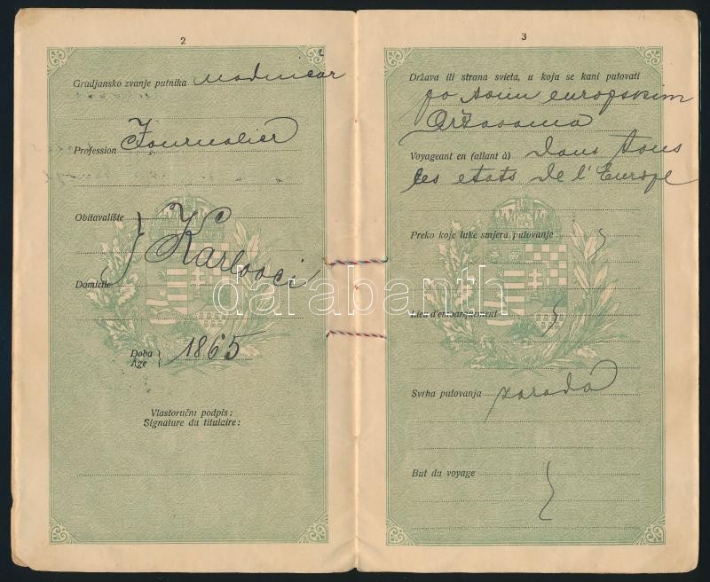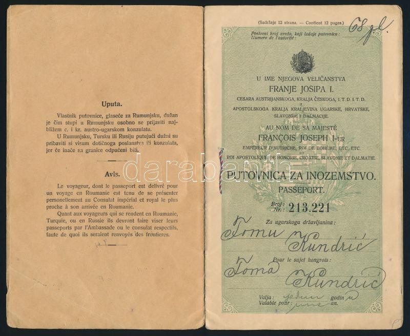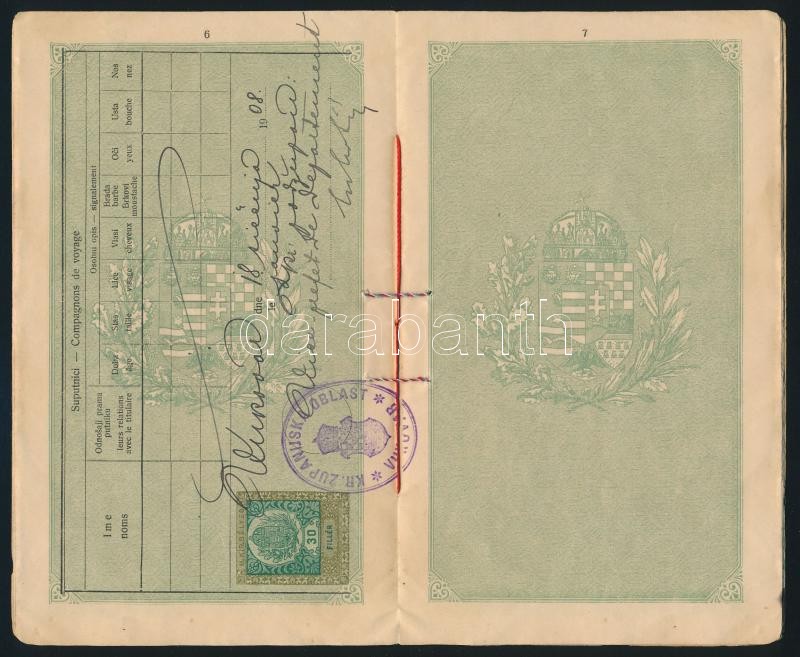 1908 Horvát és francia nyelven feliratozott magyar útelvél horvát férf... https://www.darabanth.com/de/335-Fernauktion/335.0/Kunst-Dokumente-andere-Sammelgebiete/Dokument~500017/1908-Horvat-es-francia-nyelven-feliratozott-magyar-utelvel-horvat-ferfi-reszere-Croatian-~II1878556