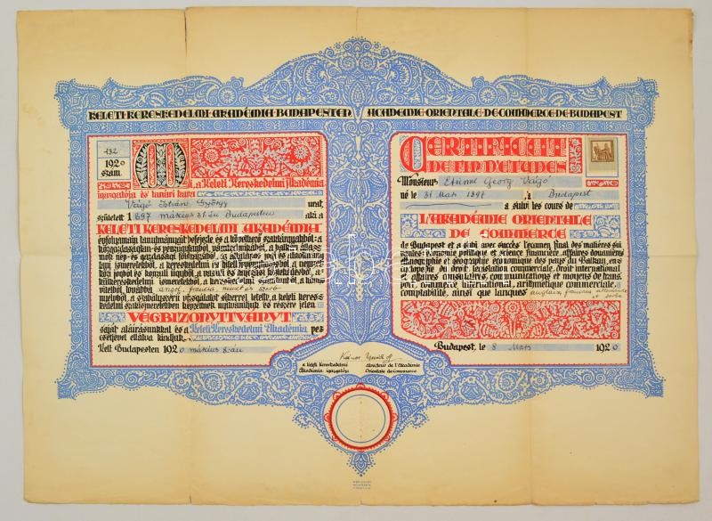 1920 Keleti Kereskedelmi Akadémia által kiállított kétnyelvű oklevél (... https://www.darabanth.com/de/335-Fernauktion/335.0/Kunst-Dokumente-andere-Sammelgebiete/Dokument~500017/1920-Keleti-Kereskedelmi-Akademia-altal-kiallitott-ketnyelvu-oklevel-vegbizonyitvany-sz~II1882626