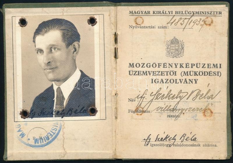 1937 Mozgófényképüzemi üzemvezetői fényképes igazolvány https://www.darabanth.com/de/335-Fernauktion/335.0/Kunst-Dokumente-andere-Sammelgebiete/Dokument~500017/1937-Mozgofenykepuzemi-uzemvezetoi-fenykepes-igazolvany~II1879855