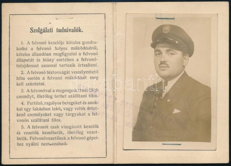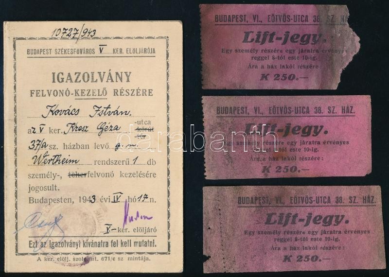 Beschreibung: 1943 Budapest Székesfőváros V. Ker. elöljárója által kiállított fényképes igazolvány felvonókezelő részére, 3 db liftjeggyel