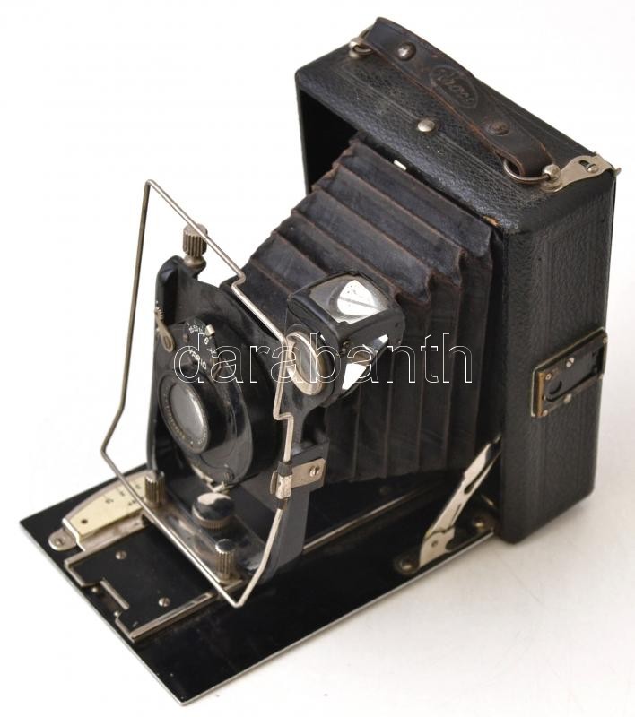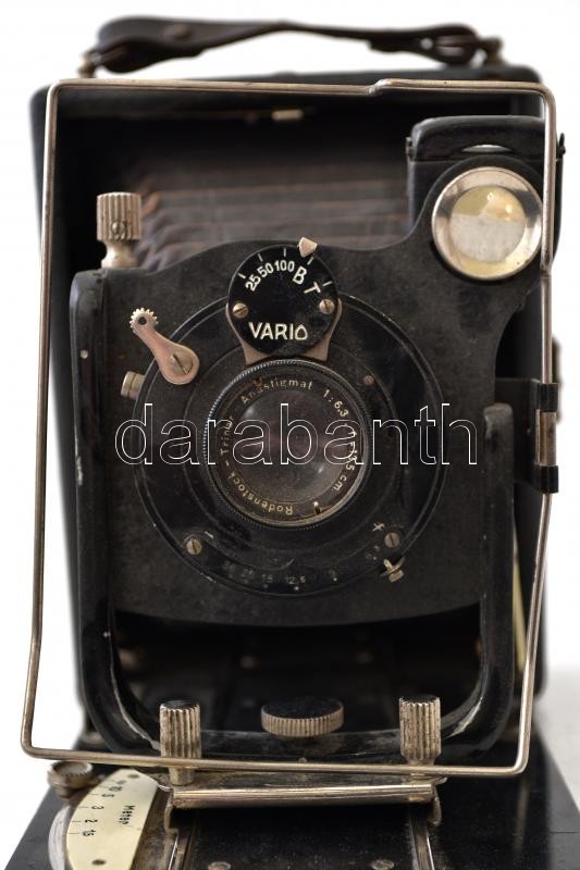cca 1930 Henning Rhaco 6,5x9 cm-es síkfilmes fényképezőgép, Rodenstock Trinar-Anastigmat 13,5 cm f/6,3 objektívvel, Vario zárral, működőképes állapotban / Vintage German 6,5x9 cm folding plate camera, in working condition
