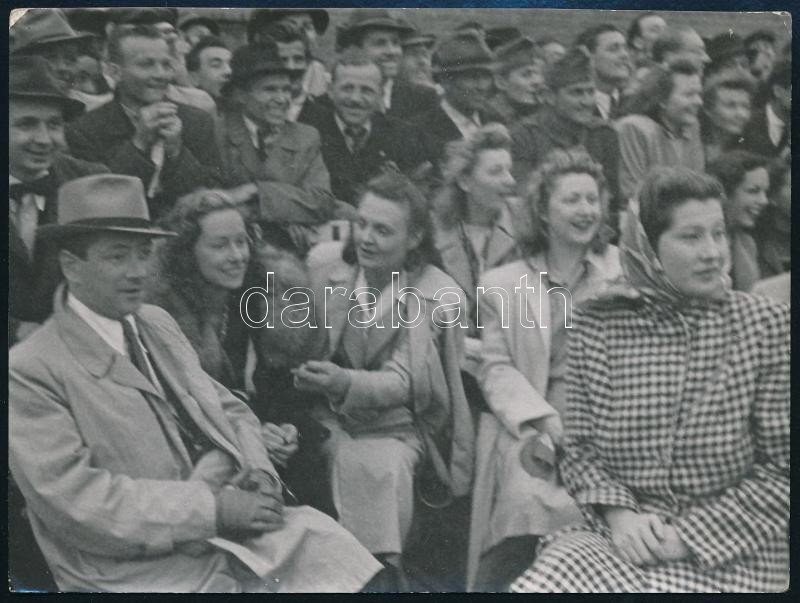 Beschreibung: Tiszavölgyi József (1909-?): Kelly Anna, Muráti Lili, Rácz Vali egy sporteseményen, pecséttel jelzett fotó, 9×12 cm