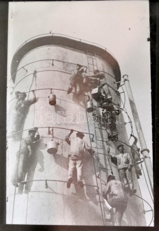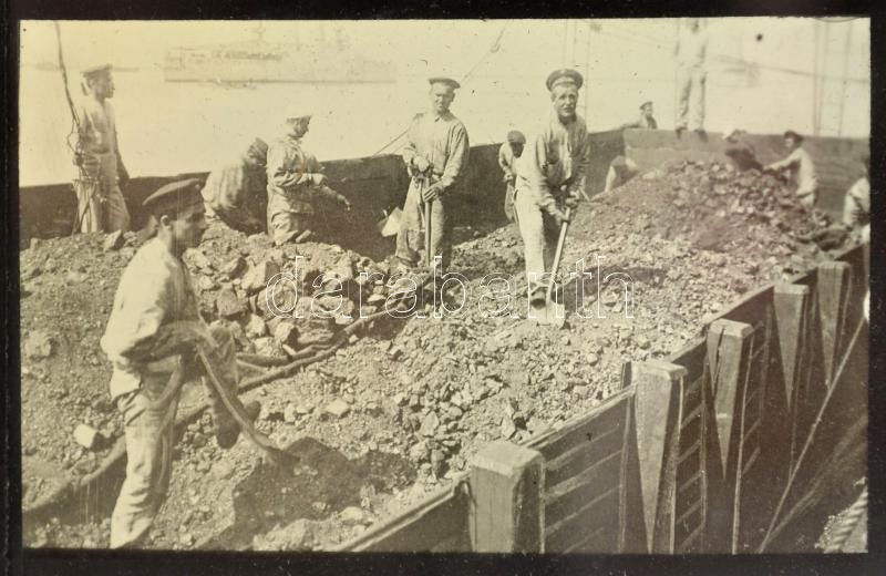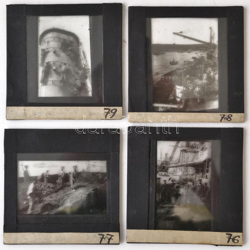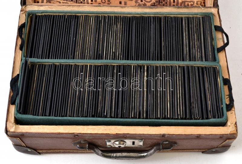 cca 1930 kb 170 db üveg diák, hajókról, városról, katonákról, kis bőröndben, feltehetőleg Győri Lajos: A császári és királyi haditengerészet békében és háborúba című könyvének a képanyaga