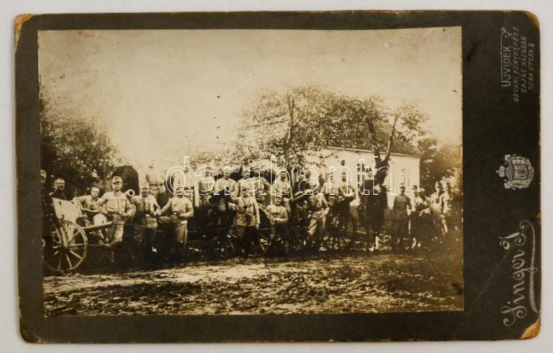 1914 Újvidék, Neusatz, Novi Sad; Osztrák-magyar tüzérek csoportképe, keményhátú fotó Singer. J. műterméből, hátoldalán M. kir. szabadkai 6. népfölkelő gyalogezred pecséttel, 12x17 cm