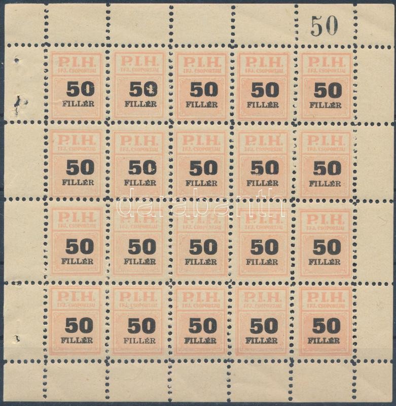 Beschreibung: ~1940 A Pesti Izraelita Hitközség ifjúsági csoport tagdíjbélyege 20 értékes kisívben