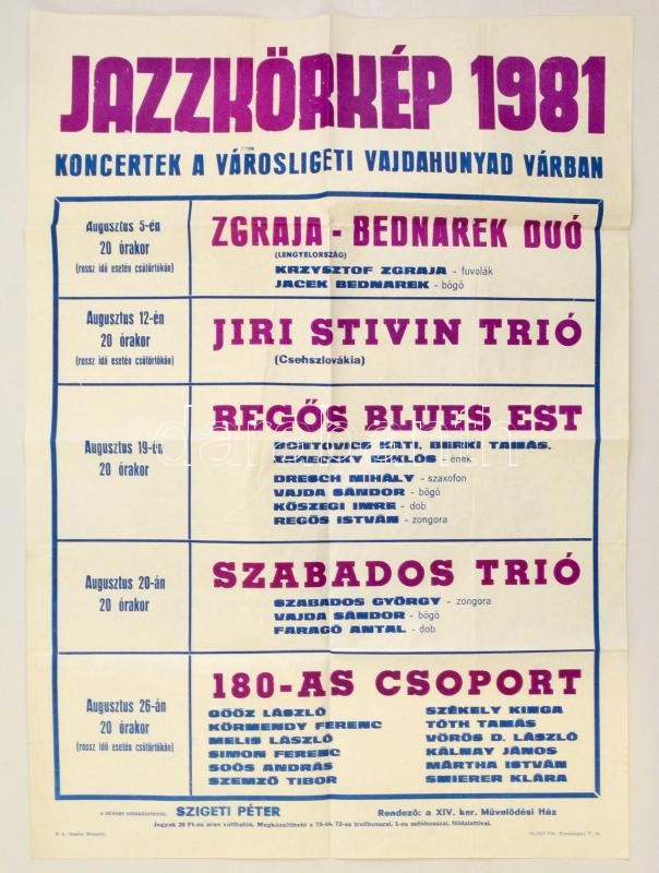 1981 Jazzkörkép, koncertek a városligeti Vajdahunyad várban, plakát, h... https://www.darabanth.com/de/335-Fernauktion/335.0/Poster/Plakat~2000081/1981-Jazzkorkep-koncertek-a-varosligeti-Vajdahunyad-varban-plakat-hajtott-70x49-5-cm~II1877872