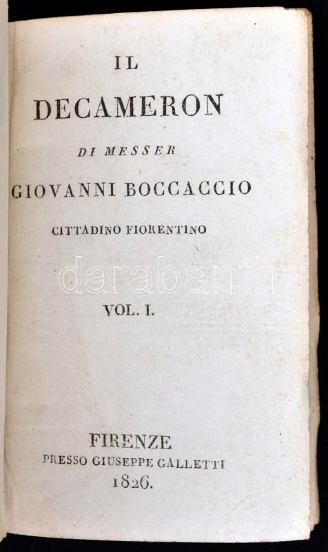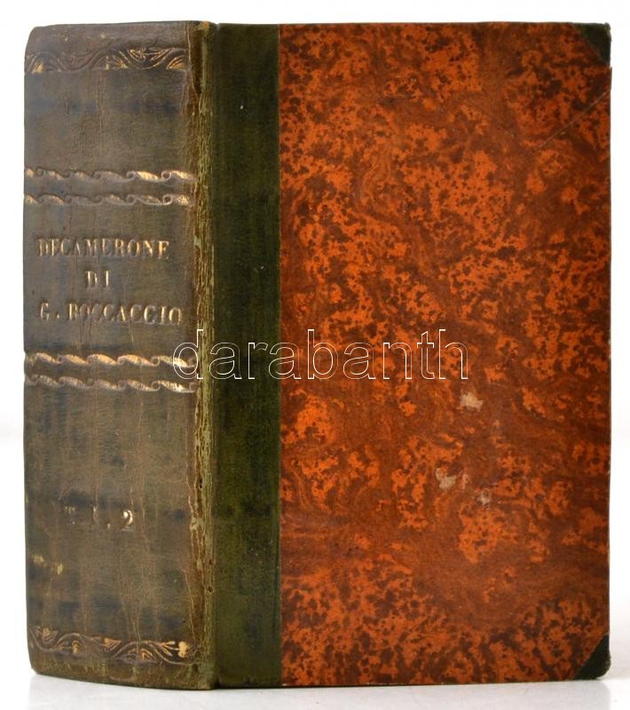 Giovanni Boccaccio: Il Decameron. I-I. kötet. Firenze, 1826, Giuseppe Galletti, 397+347 p. Olasz nyelven. Korabeli aranyozott gerincű félbőr-kötés, festett lapélekkel, jó állapotban.