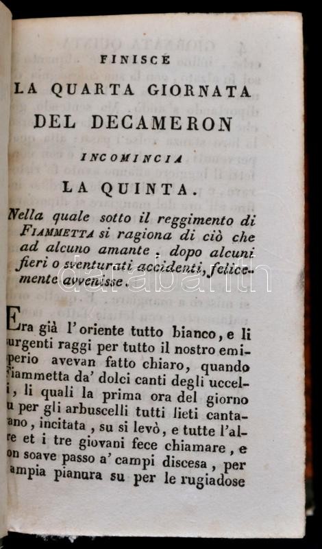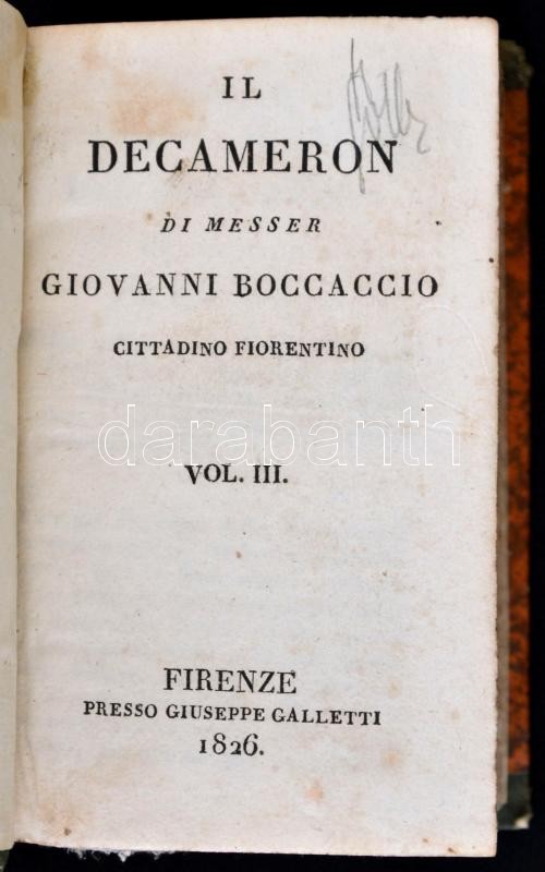 Giovanni Boccaccio: Il Decameron. III-V. kötet. Firenze, 1826, Giuseppe Galletti, 233+315+305 p. Olasz nyelven. Korabeli aranyozott gerincű félbőr-kötés, festett lapélekkel, kissé kopottak a könyv sarkai, a lapok kissé foltosak, egyébként jó állapotban.