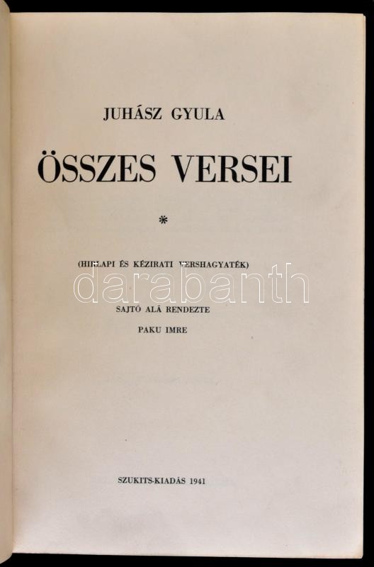 Juhász Gyula összes versei. 2. kötet. (Hírlapi és kézirati vershagyaték.) Sajtó alá rendezte: Paku Imre. Szeged, 1941, Szukits, 392 p. Korabeli aranyozott, álbordás gerincű félbőr-kötés, kopott borítóval, a gerinc alsó részén kis sérüléssel.