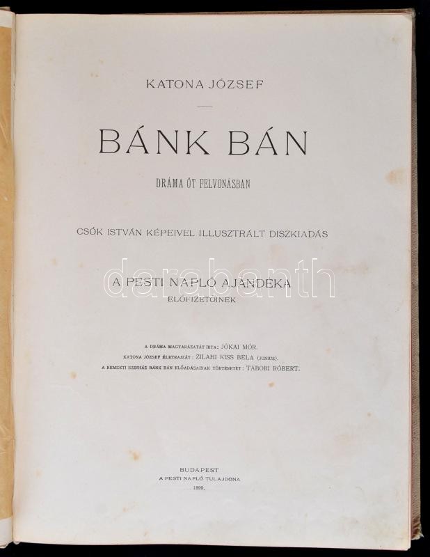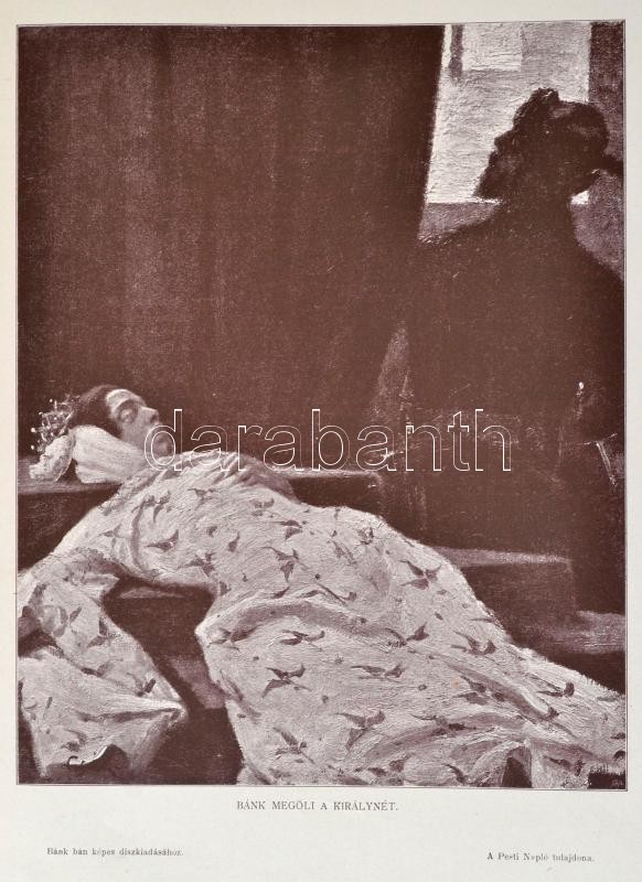 Katona József: Bánk bán. Dráma öt felvonásban. Csók István képeivel illusztrált díszkiadás. A Pesti Napló ajándéka előfizetőinek. Bp., 1899, Pesti Napló. Kiadói aranyozott, festett egészvászon kötés, Gottermayer-kötés, festett lapélekkel, kissé kopott borítóval, a gerincen kis sérüléssel, de egyébként jó állapotban.