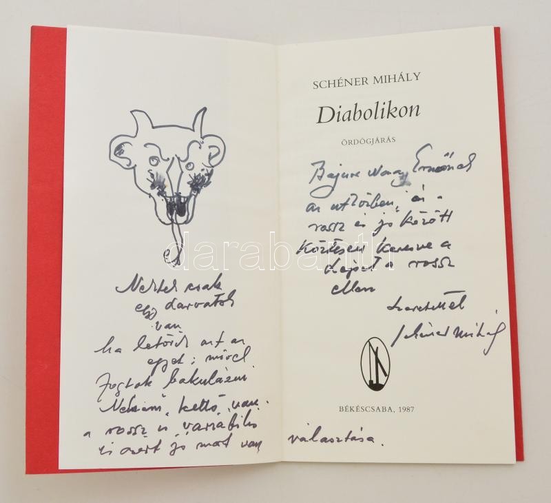 Schéner Mihály: Diabolikon. Ördögjárás. Békéscsaba, 1987, Új Aurora. Papírkötésben, jó állapotban. A szerző, Schéner Mihály (1923-2009) dedikációjával Bajor Nagy Ernő (1923-2010) újságíró részére. + 1 db Schéner fényképes levelezőlap