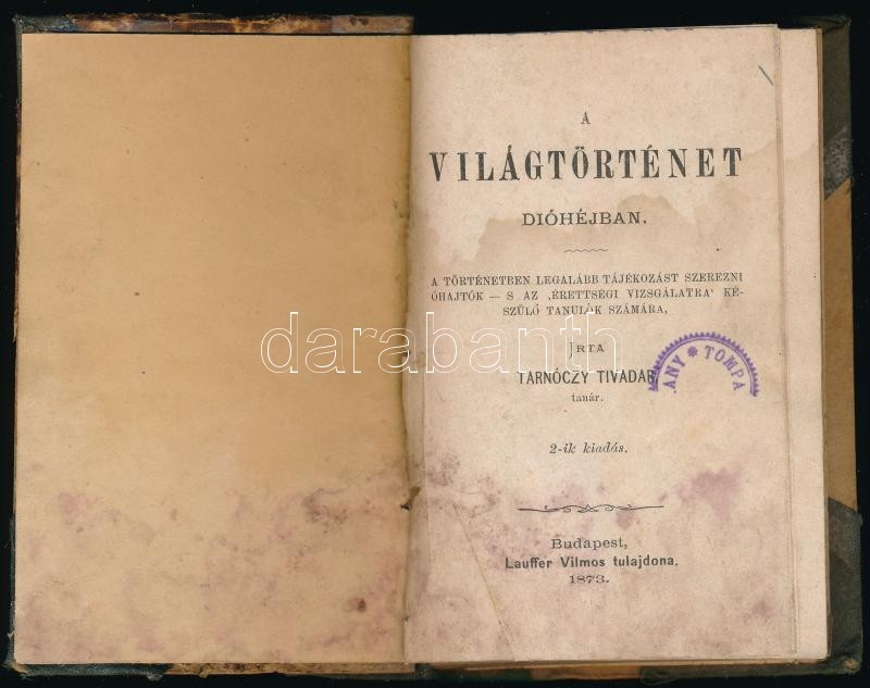 Tarnóczy Tivadar: A világtörténet dióhéjban. Bp., 1873, Lauffer Vilmos, 214+2 p. Második kiadás. Átkötött amatőr félvászon-kötés, foltos, kopott borítóval, foltos lapokkal, egy kijáró lappal, megviselt állapotban.