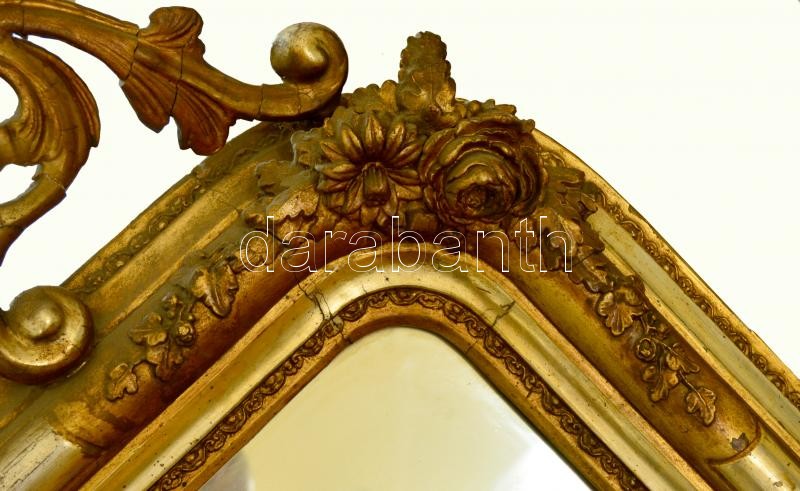XIX. sz.: Nagyméretű faragott velencei tükör. Faragott fa, gipsz rátétekkel, gazdagon díszítve. Gipsz díszek egy része megerősítésre szorul, hiányos. Tükör mérete: 103x61 cm, Teljes magasság 152 cm / Large carved mirror.