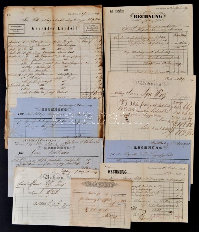 1858-1889 13 db régi számla (Moson, Győr) https://www.darabanth.com/de/336-Fernauktion/336.0/Kunst-Dokumente-andere-Sammelgebiete/Dokument~500017/1858-1889-13-db-regi-szamla-Moson-Gyor~II1887826