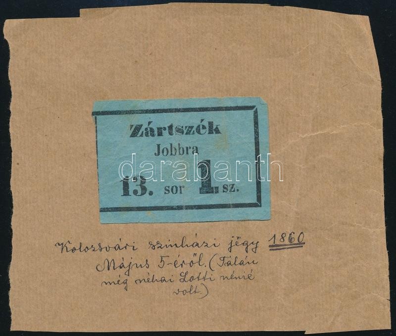 1860 Kolozsvár, színházjegy https://www.darabanth.com/de/336-Fernauktion/336.0/Kunst-Dokumente-andere-Sammelgebiete/Dokument~500017/1860-Kolozsvar-szinhazjegy~II1888178